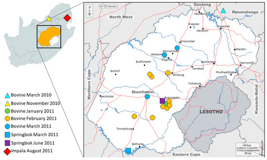 Map of South Africa, with the Free State province (in orange) highlighted in the square, indicating the LSDV PCR-positive cases from cattle and springbok. The cattle samples are indicated with circles if they were only PCR positive, whilst the samples that were partially sequenced are indicated with triangles. Complete genome sequences of the LSDVs were performed for the two springbok samples indicated with squares. The location of the impala sample is indicated with a red diamond.