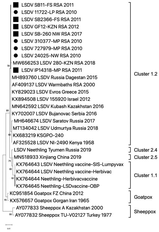 Phylogenetic relatedness of LSDVs based on the partial ORF LW036 sequences, as compared to sheeppox and goatpox viruses. The sequences of three springbok, one giraffe and one impala sample are indicated with black squares, whilst the bovine samples are indicated with circles. The maximum likelihood phylogenetic tree was constructed in Mega X.