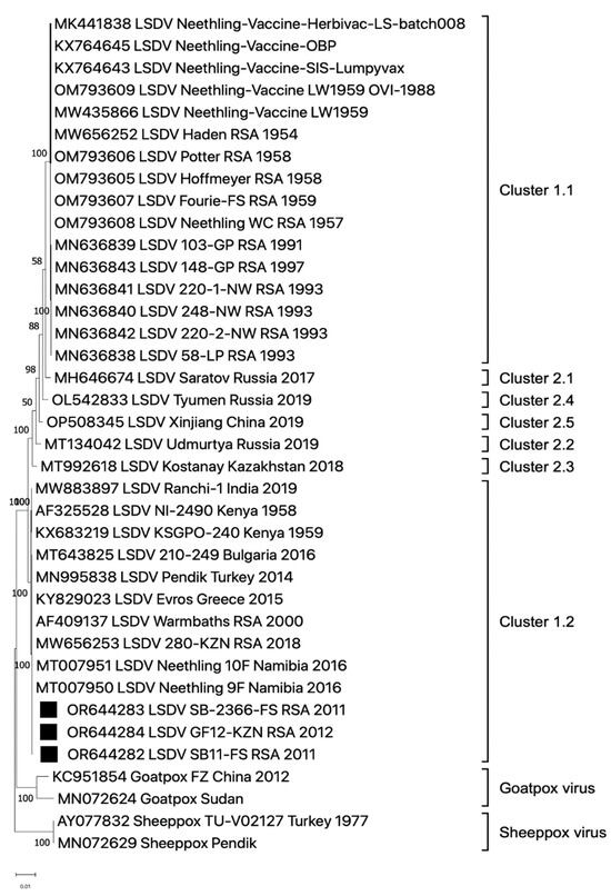Phylogenetic relatedness of LSDVs based on their complete genome sequences, as compared to sheeppox and goatpox viruses. The complete genomes of two springbok and one giraffe sample are indicated with black squares. The maximum likelihood phylogenetic tree was constructed in Mega X.