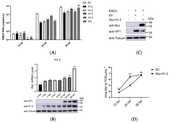 (A) HEK293T cells were transfected with empty vector (EV, 1 μg) or the pCMV−Myc−H1.2/H1.3/H1.4/H1.5/H1t plasmids (1 μg) for 24 h, and then were infected with EMCV at an MOI of 0.0001 for 12 h, 24 h, and 36 h. Genomic copies were determined using RT−qPCR. (B) HEK293T cells were infected with EMCV at an MOI of 0.0001 at 0 h, 1 h, 2 h, 4 h, 8 h, 12 h, 24 h, and 36 h. RT−qPCR (up) and immunoblotting (down) were used to detect the H1.2 expression. (C) HEK293T cells were transfected with empty vector (EV, 1 μg) or the pCMV−Myc−H1.2 plasmids (1 μg) and infected with EMCV at an MOI of 0.0001 at 24 h post-transfection. Immunoblotting was used to analyze the protein expression of Myc-H1.2 and VP1. Tubulin was used as a loading control. (D) Empty vector (EV, 1 μg) or the pCMV−Myc−H1.2 plasmids (1 μg) were transfected into HEK293T cells for 24 h and then infected with EMCV at an MOI of 0.0001 for 12 h, 24 h, or 36 h. Viral titers were detected using TCID50 assay (Karber’s method). Data are listed as mean ± SD of three independent experiments and measured in technical duplicate. *** p < 0.001; ** p < 0.01, * p < 0.05. ns means “no significant”.