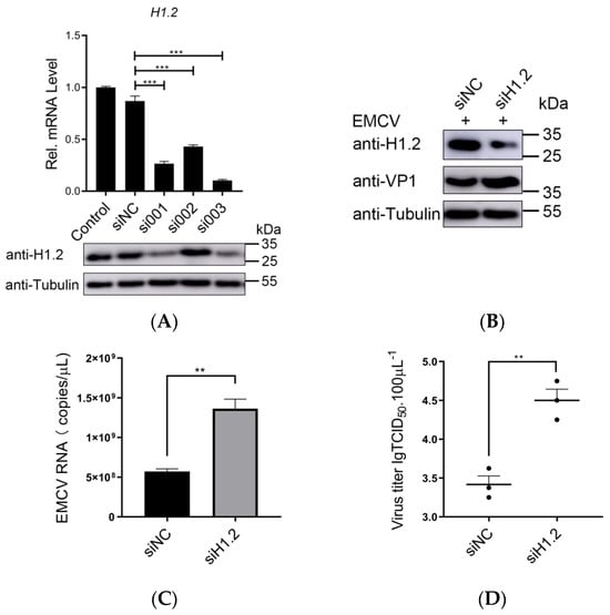 (A) siRNA targeting H1.2 was transfected into HEK293T cells for 24 h. Expression of H1.2 was explored with western blotting and RT−qPCR separately. *** p < 0.001. (B) siRNA targeting H1.2 (si003) was transfected into HEK293T cells for 24 h. Cells were then infected with EMCV at an MOI of 0.0001 for 24 h. The protein expression of H1.2 and VP1 were analyzed using immunoblotting. Tubulin was used as a loading control. (C,D) HEK293T cells were transfected with siRNA targeting H1.2 (si003) for 24 h and then infected with EMCV at an MOI of 0.0001 for 24 h. Genomic copies were determined using RT−qPCR (C) and viral titers were detected using TCID50 assay (Karber’s method). (D) Data are presented as mean ± SD of three independent experiments and measured in technical duplicate. ** p < 0.01.