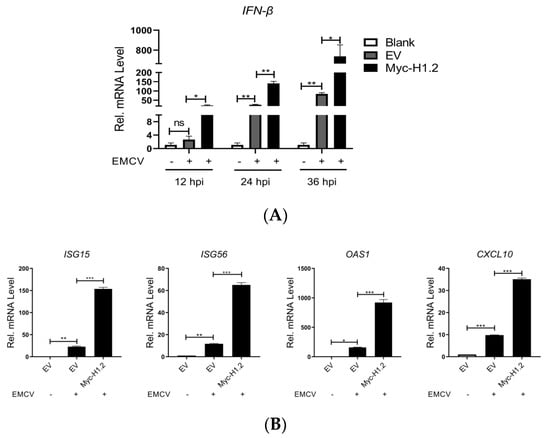 (A) HEK293T cells were transfected with empty vector (EV, 1 μg) or the pCMV−Myc−H1.2 plasmids (1 μg) for 24 h before being infected with EMCV at an MOI of 0.0001 for 12 h, 24 h, or 36 h. IFN−β mRNA expression was measured using RT-qPCR. Mock cells were used as control. ** p < 0.01, * p < 0.05 and ns means “no significant”. (B) HEK293T cells were transfected with empty vector (EV, 1 μg) or the pCMV−Myc−H1.2 plasmids (1 μg) for 24 h before being infected with EMCV at an MOI of 0.0001 for 24 h. ISG15, ISG56, OAS1, and CXCL10 mRNA levels were measured using RT−qPCR. EV groups were used as control. *** p < 0.001; ** p < 0.01, * p < 0.05.