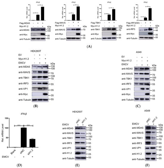 (A) In HEK293T cells, the empty vector (EV, 1 μg) or pCMV−Myc−H1.2 plasmids (1 μg) were co-transfected with indicated plasmids expressing MDA5 (250 ng), MAVS (250 ng), TBK1 (250 ng), or IRF3 (5D) (250 ng) for 24 h. The total RNA of cells was extracted and IFN−β mRNA levels were analyzed using RT−qPCR. GAPDH was used as a loading control. Data are presented as mean ± SD of three independent experiments, measured in technical duplicates. *** p < 0.001 and * p < 0.05. Western blotting was used to assess the expression of these signaling molecules as well as the H1.2 protein. HEK293T cells (B) and A549 cells (C) were transfected with the empty vector (EV, 1 μg) or pCMV−Myc−H1.2 plasmids (1 μg) and then infected with EMCV at an MOI of 0.0001 for 24 h. The protein levels of endogenous MDA5, MAVS, TBK1, and IRF3 were detected using western blotting. HEK293T cells were transfected with siRNA targeting H1.2 for 24 h and then infected with EMCV at an MOI of 0.0001 for 24 h. The mRNA expression of IFN−β was measured using RT−qPCR (D), and the endogenous proteins were detected using western blotting (E). A similar experiment was performed in A549 cell (F).
