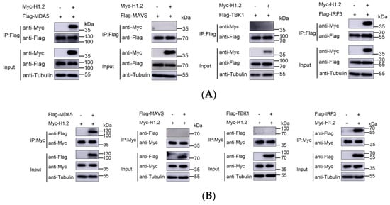 (A,B) HEK293T cells were co-transfected with pCMV−Myc−H1.2 (1 μg) and pCMV−Flag−MDA5 (1 μg), pCMV−Flag−MAVS (1 μg), pCMV−Flag−TBK1 (1 μg), or pCMV−Flag−IRF3 (1 μg) for 36 h. The cells were used for co-immunoprecipitation and immunoblotting assays with indicated antibodies.