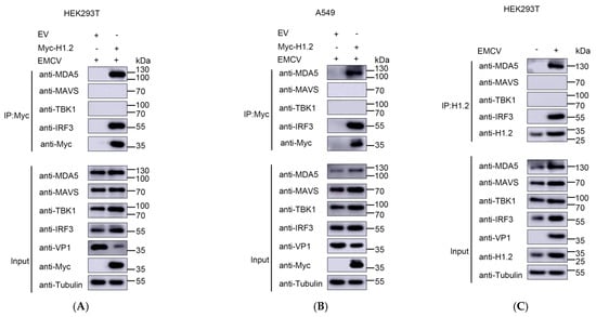 HEK293T cells (A) or A549 cells (B) were transfected with pCMV−Myc−H1.2 (1 μg) or pCMV−Myc (1 μg) for 24 h and then infected with EMCV at an MOI of 0.0001 for 24 h. The cells were collected and lysed to perform co-immunoprecipitation and western blotting assays using indicated antibodies. (C) HEK293T cells were mock-infected or infected with EMCV at an MOI of 0.0001 for 24 h. Cells were collected to perform co-immunoprecipitation using the antibody for H1.2. Western blotting was used to analyze the target proteins using indicated antibodies.
