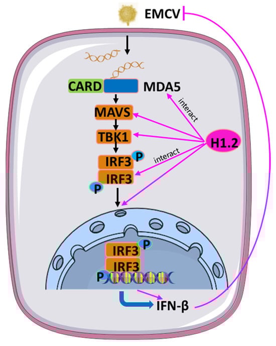 Host protein H1.2 positively regulated EMCV-induced MDA5 signaling activity by stabilizing the expression MDA5, MAVS, TBK1, and IRF3, as well as increased the phosphorylation and nuclear translocation of IRF3.