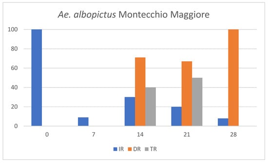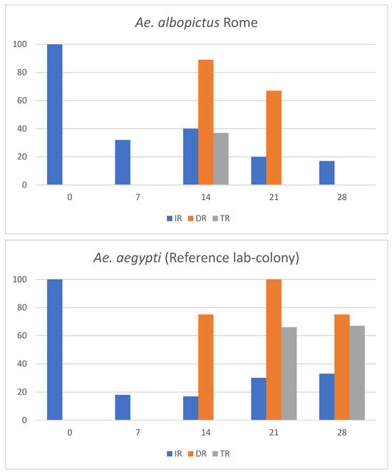 The Aedes albopictus population from Rome exhibited a higher IR (30%) compared to the other populations (18% for Ae. albopictus of Montecchio Maggiore and 22% for Ae. aegypti). However, the results highlighted a higher mean value of TR for Ae. aegypti (27%) compared to both Ae. albopictus populations (14% for Rome and 23% for Montecchio Maggiore). There was no evidence of vertical transmission in the offspring of the three Aedes populations.