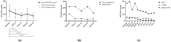 (a) Mean overall viral load dynamics with a 95% confidence interval at each time point. BL = 161 cp/mL; WK4 = 112 cp/mL; WK12 = 81 cp/mL; WK24 = 102 cp/mL; WK48 = 74 cp/mL. No significant differences were observed between the different time-points. (b) HIV-RNA dynamics (mean viral load) of responders and non-responders at different time-points. (c) HIV-RNA dynamics (mean viral load) of persistent responders, pLLV, and 1–2 blips at different time points during the study period and follow-up time.