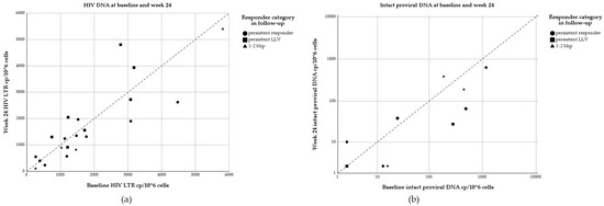 (a) Scatterplot of HIV-DNA dynamics at baseline and week 24 for the following categories: persistent responders (circle), persistent LLV (square), and individuals with 1–2 blips (triangle). No significant differences were seen in the HIV-DNA levels overall or in the subgroups. The diagonal dotted line represents an equal value at baseline and week 24. The values above the dotted line represent individuals with a higher value of HIV LTR cp/106 cells at week 24. The values under the dotted line represent higher values of HIV LTR cp/106 cells at baseline. (b) Intact proviral DNA is plotted at baseline and week 24 on a logarithmic scale. The area under the dotted line represents higher values of intact proviral DNA in cp/106 cells at baseline, and the values above the dotted line represent a higher value at week 24.