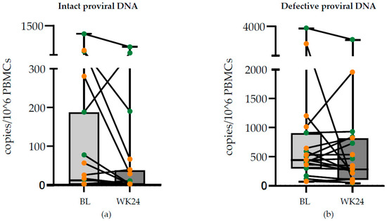 A trend towards lower levels of intact proviral DNA levels at week 24 compared to the baseline was observed (p = 0.050), possibly more pronounced in non-responders (p = 0.080) and not seen in responders (p = 0.249) (Figure 3a). This trend was not seen in the defective fractions of proviral DNA (p = 0.398) (Figure 3b).