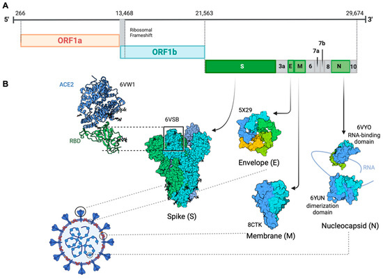 Genomic organization of SARS-CoV-2. (A) The 5′ end of the SARS-CoV genome consists of open reading frame (ORF) 1a/b that encodes a polyprotein. The 3′ terminus of the viral genome contains ORFs encoding the four main structural proteins, spike (S), envelope (E), membrane (M), nucleocapsid (N), ORF3a, ORF6, ORF7a/b, ORF8, and ORF10. (B) Protein Data Bank (PDB) identifier: spike, 6VXX; envelope, 5X29; membrane 8CTK; nucleocapsid, 6VYO and 6YUN. RBD, receptor-binding domain; ACE2, angiotensin-converting enzyme 2.