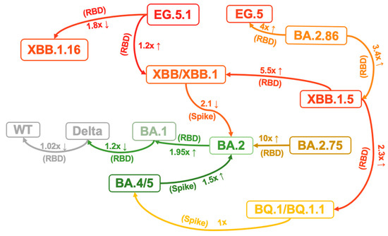 - Wang, Q.; Iketani, S.; Li, Z.; Liu, L.; Guo, Y.; Huang, Y.; Bowen, A.D.; Liu, M.; Wang, M.; Yu, J.; et al. Alarming Antibody Evasion Properties of Rising SARS-CoV-2 BQ and XBB Subvariants. Cell 2023, 186, 279–286.e8. [Google Scholar] [CrossRef]