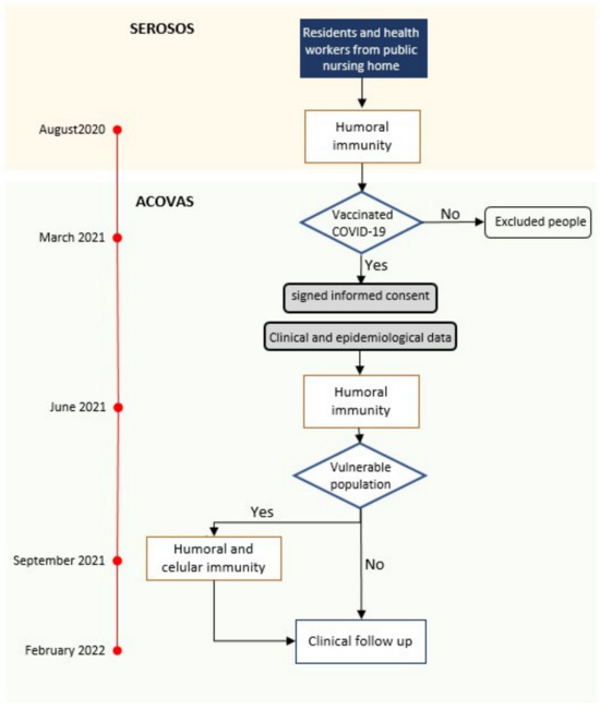 This prospective study enrolled residents and staff of two nursing homes in Madrid between August 2020 and February 2022. The study involved four analysis time points, including serum sample collections at three different time points. These intervals were selected to assess immunity status before and after vaccination due to the heightened risk among these populations and the absence of specific data available at the study’s outset. Information regarding these time points is detailed in Figure 1.