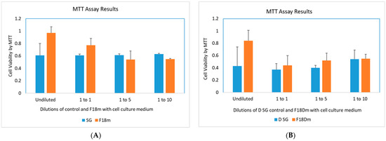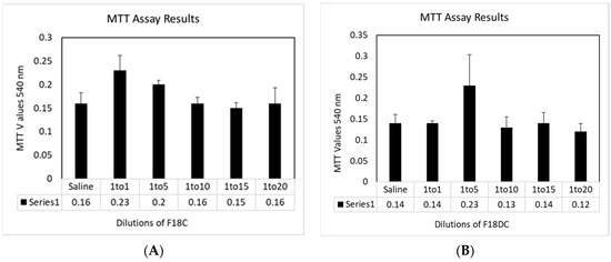 For the F18Dm nanoformulation, the results shown in Figure 7B indicated that undiluted (1.4 mM EC16m) F18Dm gave an MTT value of 0.84 ± 0.17, higher than the D SG control value of 0.43 ± 0.31 but without statistical significance (one-way ANOVA, p = 0.12, n = 3). At a 1:1 dilution (0.7 mM EC16m), there was no significant difference in MTT values between F18Dm and D SG formulations (0.44 ± 0.16 vs. 0.37 + 0.10, p = 0.57). When EC16m was diluted to 0.35 mM and 0.14 mM, there was no statistical difference in MTT values compared to the control (0.52 ± 0.12 vs. 0.40 ± 0.04, p = 0.17; and 0.55 ± 0.07 vs. 0.54 ± 0.15, p = 1.0). The untreated cells gave an MTT value of 0.59 ± 0.07.