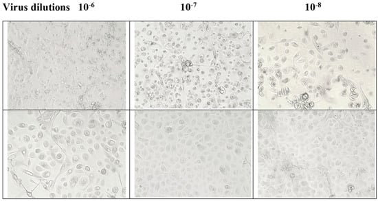 As shown in Figure 6, OC43-infected cells exhibited CPE in both 10−6 and 10−7 dilutions (upper row). The 10−6 dilution showed mostly dead cells, and the well at 10−7 dilution demonstrated typical cytopathic morphology, with a rounded cell shape and detachment from the surface. In contrast, F18m-treated wells are not associated with cell death or CPE morphology in the wells. These observations suggested that OC43 infects HNpECs and causes a cytopathic effect, whereas F18m-treated cells show no evident effect of viral infection.