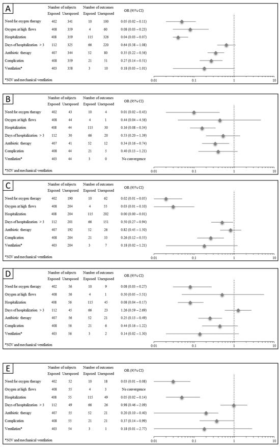 The adjusted odds ratios (ORs) for the association between SARS-CoV-2 exposure compared to other overall and specific viral RTIs and all outcomes of interest are reported in Figure 1. SARS-CoV-2 infections had a significantly reduced risk of (i) need for oxygen therapy, ranging from 92% (Panel D) to 99% (Panel B); (ii) oxygen at high flow, ranging from 97% (Panel C) to 92% (Panel A); (iii) hospitalization, ranging from 84% (Panel B) to 96% (Panel A); (iv) being hospitalized for more than three days, 50% (Panel C); (v) using antibiotic therapy, ranging from 65% (Panel A) to 80% (Panel E); and (vi) complications, ranging from 74% (Panel C) to 63% (Panel E).