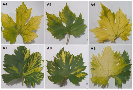 Symptoms in grapevine cultivars used for library construction. (A4,A6) Yellows in V. vinifera cv. Peykani; (A5) pale yellows in V. vinifera cv. Askari-Bidaneh; (A7) severe vein banding in V. vinifera cv. Rezghi; (A8) vein banding and sharpening of edges in V. vinifera cv. Sahebi; and (A9) yellows with severe vein banding V. vinifera cv. Fakhri.