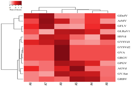 Heatmap displaying hierarchical clustering of the Iranian grapevine virome composition profiles, represented by the normalized relative abundance per grapevine sample. Heatmap color (white to dark red) displays the relative abundance of each virus across all samples. The heatmap drawn using the Euclidean dissimilarity matrix and the complete linkage distance in Heatmapper (http://www.heatmapper.ca/, accessed on 22 July 2023).