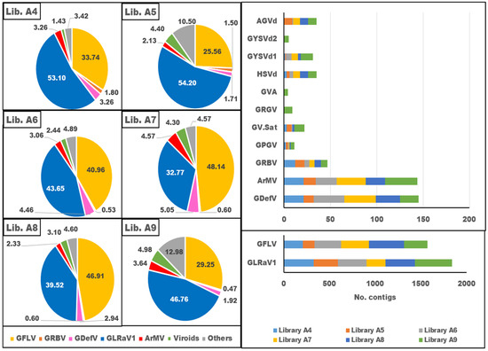 In library A4, GLRaV1 and GFLV dominated in the virome with 53.1% and 33.74% of the viral population, respectively, whereas GDefV, ArMV, and GRBV accounted for 3.26%, 3.26%, and 1.8% of the viral population, respectively, and the other viruses occupied 3.42% of the virome (Figure 4, Table 4). In library A5, GLRaV1 and GFLV shared 54.2% and 25.56% of the virome, respectively, while GDefV, ArMV, and GRBV displayed 1.71%, 2.13%, and 1.5% of the viral population, respectively, and the other viruses had 10.5% of the population (Figure 4, Table 4). In library A6, GLRaV1, GFLV GdefV, ArMV, and GRBV represented 43.65%, 40.96%, 4.46%, 3.06%, and 0.53% of the virome, respectively, and the other viruses formed 4.89% of the population (Figure 4, Table 4). Only eight viruses were identified in library A7. GLRaV1, GFLV, GDefV, ArMV, and GRBV were the most abundant viruses in library A7, with 32.77%, 48.14%, 5.05%, 4.57%, and 0.6% frequency in the viral population. The other detected virus formed 4.57% of the population (Figure 4, Table 4). In library A8, GLRaV1 and GFLV, with 39.52% and 46.91% frequency in the viral population, respectively, were dominant species in the virome, while GDefV, ArMV, and GRBV had 2.94%, 2.33%, and 0.6% of the viral population, respectively. The other viruses formed 4.6% of the virome (Figure 4, Table 4). The highest number of identified viruses was found in library A9. GLRaV1 dominated the virome with 46.76% of the viral population. GFLV, GDefV, ArMV, and GRBV, with 29.25%, 1.92%, 3.64%, and 0.47% of the viral population, respectively, were other abundant viruses in library A9. The other thirteen identified viruses/viroids occupied 12.98% of the virome. CEVd, HSVd, and GYSVd1 were identified in all libraries, but AGVd and GYSVd2 were detected only in three libraries (A5, A6, and A9) and one library (A9), respectively (Figure 4, Table 4).