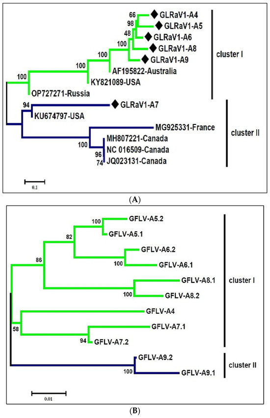 The nearly complete genomes of six Iranian isolates of GLRaV1 and eight complete GLRaV1 genomes from other counterparts previously deposited in GenBank were aligned and used to construct a phylogenetic tree. In the phylogeny tree, GLRaV1 isolates were put into two distinct clades with high bootstrap support (Figure 5A). GLRaV1-A4, GLRaV1-A9, GLRaV1-A8, GLRaV1-A6, and GLRaV1-A5 isolates together with mild GLRaV1 isolates from the USA (KY821089), Russia (OP727271), and Australia (AF195822) formed one clade, and GLRaV1-A7 together with GLRaV1-severe isolates from the USA (KU674797), Canada (JQ023131, NC_016509, MH807221), and France (MG925331) were in the other clade (Figure 5A). The presence of any GLRaV1 phylo-groups was not associated with grapevine cultivars. Comparative analysis revealed nucleotide (NT) identities within clade-I and Among all detected viruses, the consensus sequences of GLRaV1, GFLV, and GYSVd1 were retrieved from the six scrutinized libraries and subjected to phylogenetic analysis together with the corresponding sequences in GenBank.