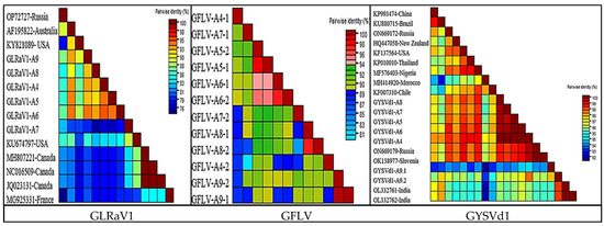 Graphical representation of pairwise nucleotide identity (with percentage identity scale) of grapevine leafroll-associated virus 1 (GLRaV1), grapevine fanleaf virus (GFLV), and grapevine yellow speckle viroid 1 (GYSVd1) with corresponding sequences from other locations. Sequence alignment using Muscle and the calculation of the identity matrix performed by SDT V.1.