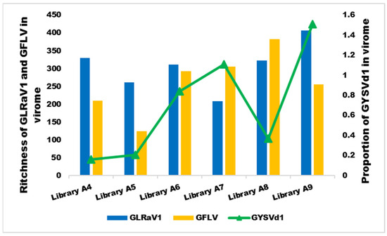 A mixed infection of GLRaV1/GFLV/GYSVd1 was detected in the virome of all samples. In libraries A4, A5, and A9, the dominant species was GLRaV1, with a concentration 1.6–2 times higher than GFLV. In libraries A7 and A8, GFLV was also the predominant virus, and its abundance was 1.45- and 2-fold higher than that of GLRaV1, respectively. In library A6, GLRaV1 and GFLV had similar concentrations (Table 4). The concentration of GYSVd1 was low in libraries A4, A5, and A8, whereas it increased 2–3.7-fold in libraries A6, A7, and A9 (Figure 7).