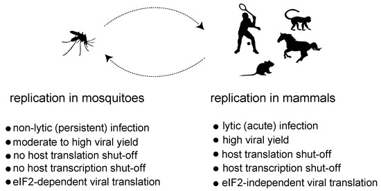 Although alphavirus replication has been studied mainly in mammalian cells, comparative analyses also found similar vRCs associated with the membrane-bound spherules in insect cells infected with SINV and other alphaviruses, suggesting that the basic aspects of alphavirus replication are conserved among these hosts [28,29]. However, the outcome of virus replication in mammalian and insect cells is different, suggesting the existence of underlying differences in the way virus replication impacts the host cell physiology. Alphavirus replication in mammalian cells is highly productive, and it is generally associated with a strong cytopathic effect that precedes cell lysis. In mosquito cells, however, alphaviruses easily establish nonlytic, persistent infections, where an active viral replication occurs without signs of a cytopathic effect (Figure 2) [28,30,31]. This fact nicely reflects how alphaviruses and other arboviruses use insects both as reservoirs to persist in nature and as vectors to ensure transmission to vertebrate hosts. At a molecular level, the replication of alphaviruses in mammalian cells is associated with a profound inhibition of both host transcription and translation that ultimately contributes to the cytopathogenesis. Thus, mammalian cells infected with representative Old World and New World members almost exclusively synthesize viral RNAs and proteins at later times of infection. In insect cells, on the contrary, the synthesis of large amounts of viral RNAs and proteins is well tolerated and occurs without significant interference with host transcription and translation [32,33]. This suggests that instead of relying solely on the replication process, alphaviruses employ specific mechanisms to halt gene expression in mammalian cells.