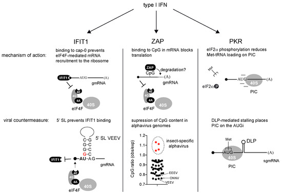 - Reynaud, J.M.; Kim, D.Y.; Atasheva, S.; Rasalouskaya, A.; White, J.P.; Diamond, M.S.; Weaver, S.C.; Frolova, E.I.; Frolov, I. IFIT1 Differentially Interferes with Translation and Replication of Alphavirus Genomes and Promotes Induction of Type I Interferon. PLoS Pathog. 2015, 11, e1004863. [Google Scholar] [CrossRef] [PubMed]