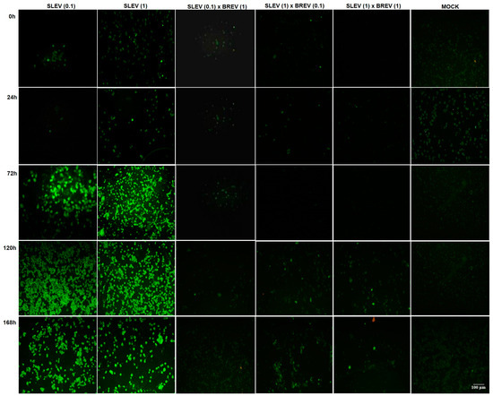 Micrographs of the detection of Saint Louis encephalitis virus (SLEV) by indirect immunofluorescence in the three combinations of MOIs used in co-infection with Brejeira virus (BREV) (SLEV 0.1 × BREV 1; SLEV 1 × BREV 0.1; SLEV 1 × BREV 1), as well as the respective positive and negative controls (Mock). Viral kinetics from 0 to 168 h post-infection, evidencing the 0 hpi, 24 hpi, 72 hpi, 120 hpi, and 168 hpi.