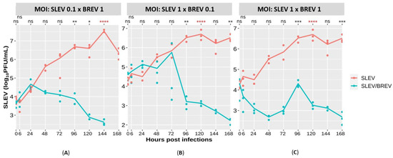 SLEV viral titers obtained by plaque assay on Vero cells, comparing the co-infections with their respective positive controls, using different concentrations of MOIs for both the arbovirus (SLEV) and BREV. (A) Viral titers with MOI of 0.1 for SLEV and MOI of 1 for BREV; (B) viral titers with MOI of 1 for SLEV and MOI of 0.1 for BREV; and (C) titers with MOI of 1 for both viruses. ns: not significant; * significant; ** very significant; *** and **** extremely significant.