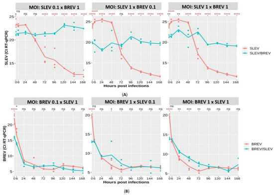 When the co-infections and the controls using RT-qPCR for SLEV were analyzed (Figure 4A), the control kept increasing throughout the viral kinetics up to 168 hpi; when compared with the co-infection with BREV, the reduction in the cycle threshold (Ct) was remarkable, with an extremely significant statistical difference from 6 hpi onwards (p < 0.0001), even when BREV was ten times less concentrated, thus suggesting that in all three conditions studied, BREV inhibited SLEV.