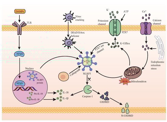 The activation of the NLRP3 inflammasome plays a dual role in the process of virus infection. On the one hand, the regulation of inflammatory responses by NLRP3 activation can affect the function of immune cells, thus affecting the antivirus. NLRP3 plays a potential role in a variety of viral infections. Influenza virus infection is a significant example; the activation of the NLRP3 inflammasome is closely related to the immune response. In the early stages of IAV infection (the first five days after infection), the activation of NLRP3 triggers the release of inflammatory factors such as IL-1 β and IL-18, which help recruit immune cells and improve their ability to fight the virus [15]. Cytomegalovirus infection also shows signs that NLRP3 may play an antiviral effect. NLRP3 activation is accompanied by the release of pro-inflammatory cytokines, which helps to improve the virus clearance ability of immune cells [16]. This suggests that NLRP3 may play a similar regulatory role in different types of viral infections. In addition, adenovirus infection shows that the activation of NLRP3 is related to the regulation of an inflammatory response. NLRP3 activation affects the immune response by regulating the release of inflammatory mediators and plays an antiviral role in adenovirus infection [17]. These examples suggest that NLRP3 inflammasomes regulate the inflammatory response and affect immune cell function in different viral infections and may have potential antivirus effects. However, more in-depth research is needed to fully understand the specific mechanism of the NLRP3 inflammasome, and its role and impact in different virus infections. On the other hand, excessive NLRP3 inflammasome activation can trigger a cytokine storm, an overdrive of the body’s immune response leading to the release of numerous pro-inflammatory cytokines. This cascade induces tissue inflammation, cellular damage, and even organ failure, contributing significantly to severe infections, autoimmune conditions (e.g., rheumatoid arthritis, systemic lupus erythematosus), and certain inflammatory diseases. Efforts to regulate NLRP3 inflammasome activation serve as a potential strategy to mitigate the intense inflammatory response associated with cytokine storms. Studies explore this avenue as a means to attenuate severe inflammatory conditions. For example, in hepatitis C virus (HCV) infection, NLRP3 activation drives a network of pro-inflammatory cytokines, chemokines, and immunomodulatory genes, exacerbating chronic intrahepatic inflammation and liver injury [18]. Moreover, cytokine storm pathogenesis is implicated in diseases like severe dengue (DENV) [19], where DENV-mediated NLRP3 inflammasome activation prompts IL-1β and IL-18 secretion [20], exacerbating vascular permeability in severe cases [21]. Furthermore, the direct interaction of the SARS-CoV-2 N protein with NLRP3 triggers inflammasome formation, leading to excessive inflammation, acute lung injury, and hastened sepsis-induced mortality [22]. Additionally, a polypeptide analogue of the Hendra virus C protein (HEVC) has been identified to aggregate and activate NLRP3 inflammasomes, inducing severe inflammatory lung and nervous system diseases upon phagocyte uptake [23]. Therefore, a comprehensive exploration into the mechanisms governing NLRP3 activation holds promise in uncovering novel targets and strategies for treating and preventing inflammation-related diseases.