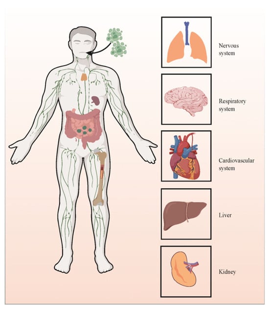 Furthermore, the involvement of the NLRP3 inflammasome is paramount in the pathogenesis of multi-organ damage induced by COVID-19. Patients infected with SARS-CoV-2 exhibit damage across various organs, including the lungs, brain, liver, kidney, and spleen (Figure 2). Severe cases of COVID-19 are associated with the progression of intense fibrotic responses, elevating the risk of idiopathic pulmonary fibrosis. Notably, NLRP3 inflammasomes are directly implicated in the onset of pulmonary fibrosis. Autopsy findings and animal models have consistently affirmed that the aberrant expression of NLRP3 inflammasomes significantly contributes to the pathophysiological mechanisms underlying acute respiratory distress syndrome (ARDS). Pathways associated with NLRP3 result in severe clinical manifestations, tissue necrosis, heightened moisture, and intense pulmonary inflammation [48]. The neurological manifestations of SARS-CoV-2 are well-documented, encompassing a spectrum of neuropsychological disorders. Central nervous tissue involvement in COVID-19 primarily engages astrocytes and microglia, releasing pro-inflammatory cytokines and inciting neuroinflammation [49]. The pathogenicity of SARS-CoV-2 in the brain correlates with the activation of microglial NLRP3 inflammasomes. The activation of caspase-1 mediated by NLRP3 inflammasomes escalates the cleavage of IL-18 and IL-1β from their precursors, instigating their release. Consequently, activated caspase-1 can disrupt the blood–brain barrier, inciting a neuroinflammatory response [50]. Elevated IL levels stimulate neurons, astrocytes, and microglia to initiate the production of additional pro-inflammatory mediators, thereby instigating neuroinflammation. Notably, liver-related symptoms have been observed in COVID-19 patients, with hepatic sinusoid and pericellular fibrosis detected in autopsy specimens [51]. Under inflammatory conditions, the activation of Kupffer cells, through various mechanisms, can precipitate liver injury and fibrosis via the dysregulation of NLRP3 inflammasomes and excessive IL-1β production [52]. Furthermore, SARS-CoV-2 may infect kidney cells in COVID-19 patients, leading to kidney injury. In cases of SARS-CoV-2 infection, the infiltration of pro-inflammatory cells, such as CD68+ macrophages, into the renal tubulointerstitium has been observed [53]. Macrophage infiltration significantly contributes to inflammation, fibrosis, and renal injury. While there are no specific data supporting the direct involvement of NLRP3 inflammasomes in the pathogenesis of SARS-CoV-2-induced acute renal failure (ARF), certain studies suggest that the aberrant activation of NLRP3 inflammasomes is associated with inflammatory diseases related to ARF [54].
