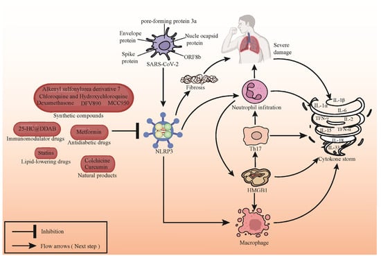SARS-CoV-2 is a coronavirus that causes COVID-19. The release of a high amount of cytokines leads to severe inflammation and acute damage to multiple organs following SARS-CoV-2 infection [24]. The interaction between the infection mechanism and immune response is very important for disease progression, profoundly influencing disease progression. Emerging studies highlight that SARS-CoV-2 infection prompts the potential activation of NLRP3 inflammasomes within host cells. Notably, an overactive response involving NLRP3 inflammasome activation and the subsequent uncontrolled production of neutrophil extracellular traps (NETs) are regarded as critical facets of severe disease manifestation [25,26,27]. The activation and prolapse of NLRP3 inflammatory bodies were detected in monocytes and macrophages during SARS-CoV-2 infection [28]. In addition, danger signals, such as calcitonin, which have been recently associated with the severity of COVID-19, are known to activate or release NLRP3 inflammasomes as a result of their activation, and may cause prolapse [29].