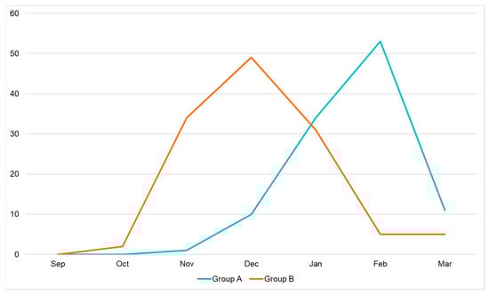 In Group A (patients admitted in the period before the SARS-CoV-2 pandemic), the peaks in admissions occurred between November and March, usually lasting 2–4 months. Cases increased significantly in December and peaked in January and February, with only a few cases reported in March.
