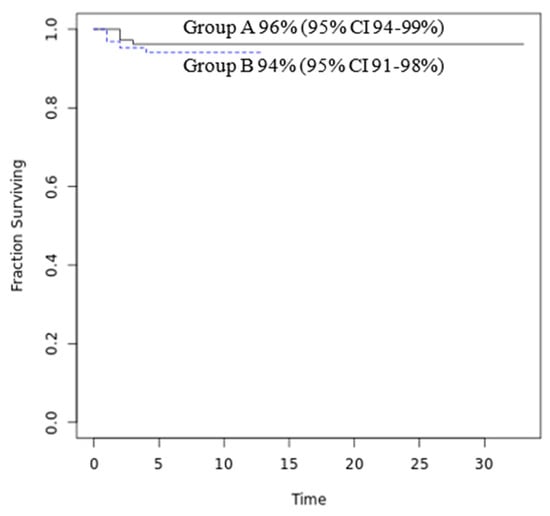 Finally, concerning the short-term outcome, the complications, the length of hospital stay, and the need to transfer to a Hub hospital were similar in the two groups. These data are provided in Table 4. Figure 2 reports the probability of treatment success (discharge to home without transfer to a Hub hospital with PICU or NICU): 96% of patients in Group A and 94% in Group B.