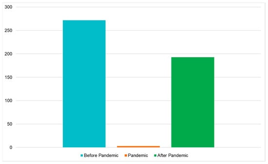 Overall, we hospitalized 468 bronchiolitis patients, 272 before the SARS-CoV-2 Pandemic (from 1 September 2017 to 31 March 2018; from 1 September 2018 to 31 March 2019; and from 1 September 2019 to 31 March 2020), 3 during the Pandemic (from 1 September 2020 to 31 March 2021), and 193 after the period of the Pandemic (from 1 September 2021 to 31 March 2022 and from 1 September 2022 to 31 March 2023).