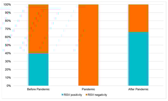 Prevalence of HRSV detected in bronchiolitis hospitalized before, during, and after the SARS-CoV-2 Pandemic.