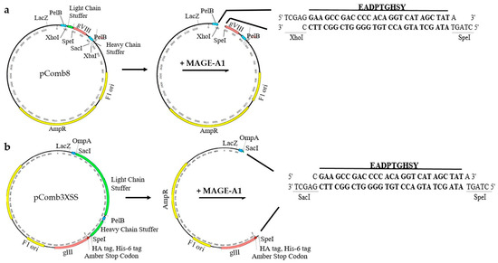 Recombinant MAGE phagemids were created via annealed oligonucleotide cloning. First, MAGE-A1161–169 fragments were created by annealing two overlapping 5′-phosphorylated oligonucleotides (Integrated DNA Technologies, IDT, Coralville, IA, USA): 5′-TCGAGGAAGCCGACCCCACAGGTCATAGCTATA-3′ and 5′-CTAGTATAGCTATGACCTGTGGGGTCGGCTTCC-3′ for cloning into the pComb8 vector, and 5′-CGAAGCCGACCCCACAGGTCATAGCTATA-3′ and 5′-CTAGTATAGCTATGACCTGTGGGGTCGGCTTCGAGCT-3′ for cloning into the pComb3XSS vector. Oligo annealing was performed with a QuantStudio 3 qPCR System (Applied Biosystems™, Waltham, MA, USA) by heating the suspension of oligonucleotides in equimolar concentrations (100 µM) to 95 °C over 4 min and gradually cooling down to 25 °C over 60 min. MAGE-A1 fragments were then ligated with backbone DNA fragments of digested pComb3XSS, 3342 bp, and pComb8, 3252 bp, using T4 DNA ligase at room temperature (RT) for one hour. The schematic representation of the construction of the recombinant phagemids is presented in Figure 1.