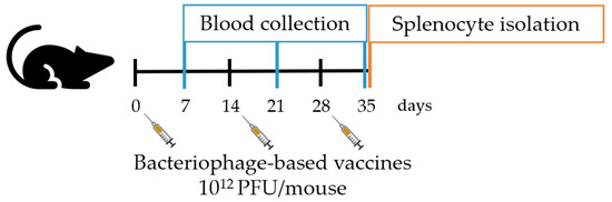 The experiments performed in this study complied with the guidelines for animal experiments from the EU directive (2010/63/EU) and with the permission of the Administration of the Republic of Slovenia for Food Safety, Veterinary and Plant Protection (Republic of Slovenia, Ministry of Agriculture, Forestry and Food, permission no. U34401-3/2022/11) and were in accordance to the 3R principle. The animals used were 6–8-week-old female C57BL/6NCrl mice (Charles River, Lecco, Italy). Mice were maintained in specifically pathogen-free conditions in a carousel mouse IVC rack system (Animal Care Systems Inc., Centennial, CO, USA) at 20–24 °C, 55 ± 10% humidity, and with a 12 h light/dark cycle. Food and water were provided ad libitum. Mice (5 mice per group/cage) were injected intraperitoneally three times at consecutive two-week intervals (as shown in Figure 2) with 300 µL of: (1) genetically engineered pVIII::MAGE-A1161–169 bacteriophages (1012 PFU), (2) genetically engineered pIII::MAGE-A1161–169 bacteriophages (1012 PFU), (3) wild-type M13 bacteriophages (1012 PFU), or (4) PBS. Sera (50 µL) for ELISA assays were obtained from blood samples collected with a sterile capillary from a retro-orbital sinus one week after each boost and stored at −80 °C until use. For the ex vivo spleen cytotoxicity assay, splenocytes were collected from aseptically removed spleens one week after the last bacteriophage application and prepared as described by Komel et al. [18].