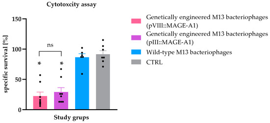 Ex vivo spleen cytotoxicity assay. The specific survival rate (%) of B16F10 malignant melanoma cells after incubation with splenocytes isolated from C57BL/6NCrl mice immunized with genetically engineered M13 bacteriophages (pVIII::MAGE-A1), genetically engineered M13 bacteriophages (pIII::MAGE-A1), wild-type M13 bacteriophages, and from the CTRL group. Legend: *, p < 0.05; ns, not statistically significant. The values are presented as the AM ± SEM. Repeated measurements are represented by black dots.