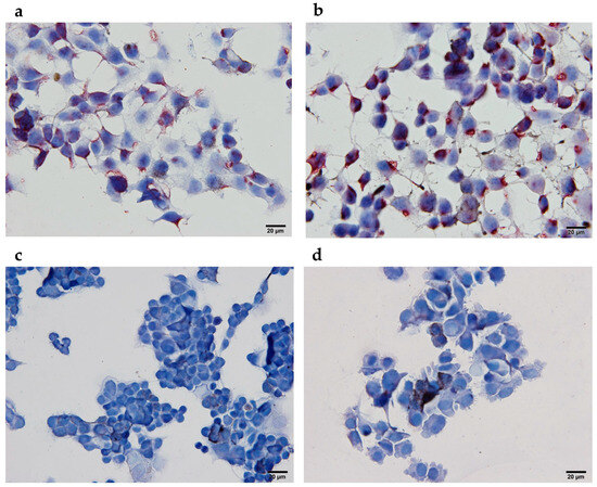 For the immunohistochemical analyses, B16F10 cells were fixed with 4% paraform-aldehyde and incubated with 100 μL of mouse serum (dilution 1:50) overnight. HRP la-belled goat anti-mouse IgG, IgM (H + L), highly cross-adsorbed secondary antibody (dilu-tion 1:1000, SAB3700986, Sigma-Aldrich, St. Louis, MO, USA), and AEC Substrate (Abcam, Cambridge, UK), as the colorogenic reagent, were used. Imaging was performed using a BX-51 microscope (Olympus, Hamburg, Germany) equipped with a digital camera (DP72; Olympus, Hamburg, Germany).