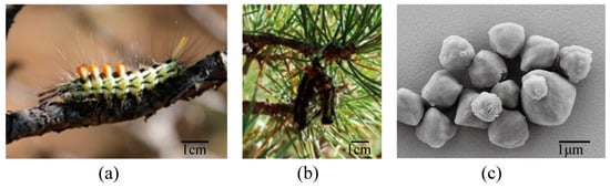 Calliteara abietis larva and Calliteara abietis nucleopolyhedrovirus (CaabNPV) scanning electron microscope (SEM). (a) A C. abietis larva feeding on pine tree. (b) Deceased C. abietis displaying pathological features indicative of baculovirus infection. (c) SEM picture depicting irregularly shaped CaabNPV occlusion bodies (OBs).