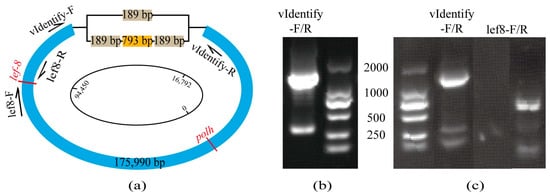 CaabNPV assembly results (a) The schematic diagram illustrates the assembly results of CaabNPV, emphasizing ambiguous regions. Arrows indicate primer sequences, and gene names are denoted in red, the light brown box represents a 189bp fragment, the orange box represents a 793bp fragment, and the remaining part of the CaabNPV genome is represented by the blue box. (b) PCR amplification of ambiguous regions in CaabNPV with vIdentify-F/R reveals large fragments consisting of two repeated 189 bp sequences interspersed with a 793 bp sequence, while small fragments consist of a singular 189 bp sequence. (c) Lane 2: Amplification of ambiguous regions in host larvae, depicting PCR amplification of ambiguous regions in the host larvae; Lane 3: Amplification of the viral lef8 fragment in host larvae; Lane 4: lef8 positive control with CaabNPV as the sample, resulting in an amplification size of 849 bp.