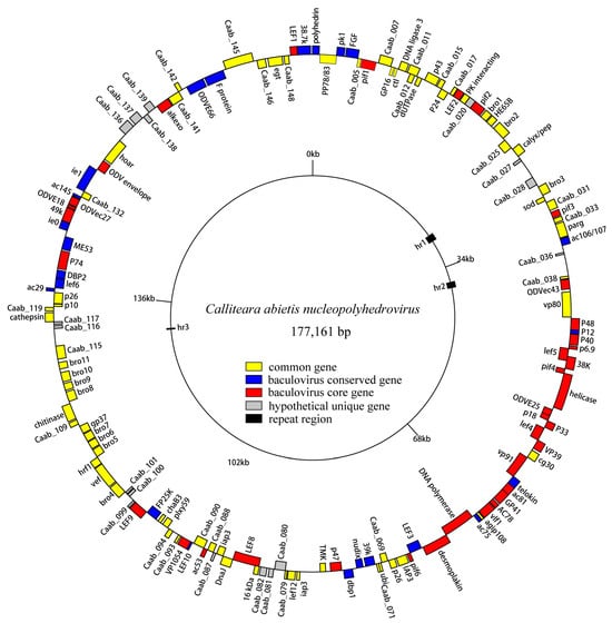 Circular map of CaabNPV genome. The colors represent gene types: red represents baculovirus core genes, blue represent baculoviruses conserved genes, yellow represents other baculovirus common genes, gray represents hypothetical genes unique to CaabNPV, black represents repeat regions.