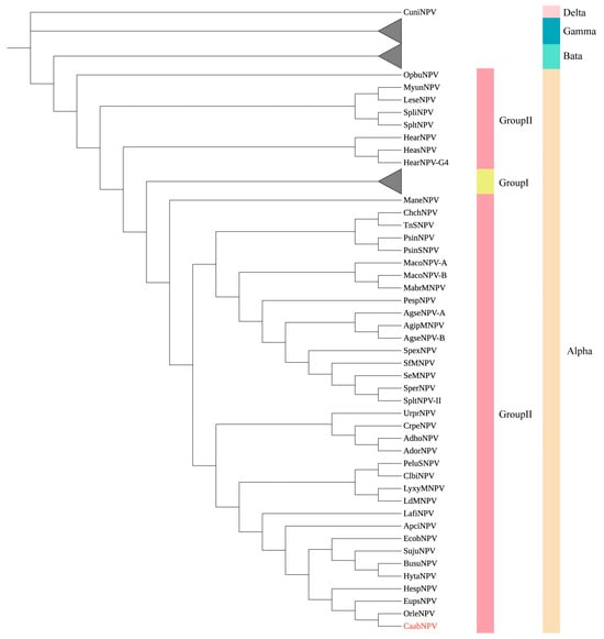 Unrooted phylogenetic tree created from the concatenated 38 core genes found in 108 sequenced baculovirus genomes. CaabNPV is marked in red. The tree was constructed using the minimum evolution method with 1000 bootstrap. Clusters representing the group I alphabaculovirus genera, Beta-, Gammabaculovirus have been simplified for clarity.