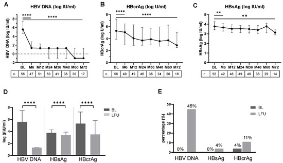 3.1. Kinetics of HBV DNA, HBsAg and HBcrAg after Initiation of NA Treatment