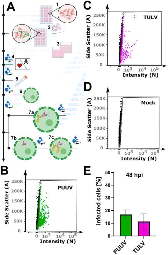 Flow cytometry workflow for quantifying orthohantavirus infection in cell culture. (A) Schematic overview of the protocol: (1) cell seeding; (2) infection with orthohantavirus for 1 h; (3) cell detachment with Accutase; (4) live–dead staining; (5) fixation with paraformaldehyde (PFA); (6) cell permeabilization with saponin; (7) staining with antibodies: either with a conjugated antibody (7a) or with a primary (7b) and a secondary (7c) antibody. (B–D) Exemplary gate settings for quantification of newly propagated virus; their analysis in (E) is a bar graph displaying the percentage of infected cells (%). Shown are mean ± SD, N = 3.