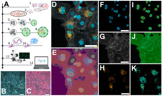 Microscopic workflow for quantifying orthohantavirus infection in cell culture. (A) Schematic overview of the protocol: cell seeding (1); infection with orthohantavirus for 1 h (2); cell fixation with paraformaldehyde (PFA) (3); blocking of unreacted aldehydes with glycine solution (4); permeabilization with Triton X-100 (5); blocking of unspecific binding sites using a BSA-containing buffer (6); staining with primary antibody against viral nucleocapsid protein (N) (7) and staining with a secondary antibody (8); phalloidin staining to label filamentous actin (9) and Hoechst for labelling dsDNA (10); and imaging via fluorescence microscopy (11) and analysis via custom software tools (12). (B,C) Exemplary images recorded with 20× magnification, showing ~500 cells. (D–K) Pairwise original images together with their masks resulting from software-based segmentation. (D) A merged image of three individual channels in (F–H): Hoechst (F) and its mask for nuclei recognition (I); phalloidin staining (G) for recognizing cell bodies or cell boundaries; and Anti-N staining (H) to reveal viral particles (K). The overlay of (I–K) is shown in (E). Scale bars = 50 µm.