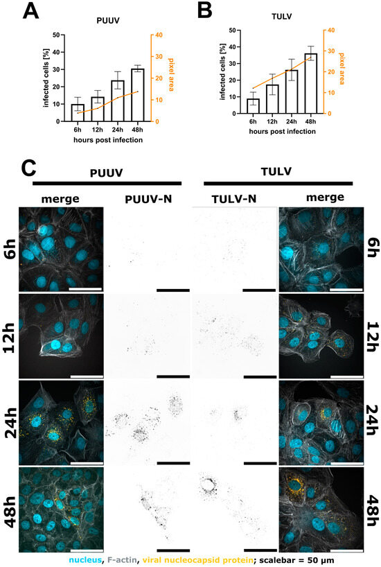 Quantification of infected Vero E6 cells 6 h, 12 h, 24 h and 48 h post-infection with either PUUV (A) or TULV (B). A comparison of the percentage of infected cells shows an increase in detected cells after 48 h compared to 6 h. We observed a correlation between the number of infected cells and the intensity per pixel. Shown are mean ± SD, n = 3. Exemplary images in (C). Merged image show nuclei in blue, F-actin in grey and the viral N protein in orange. Viral N is also shown in black as a separated image in the middle of the image panel.